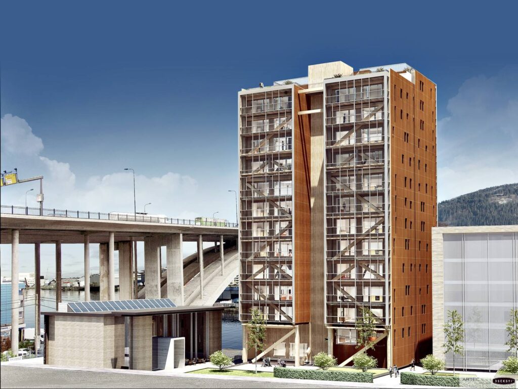 The world’s tallest wooden apartment building (14 floors) in Bergen (Norway)